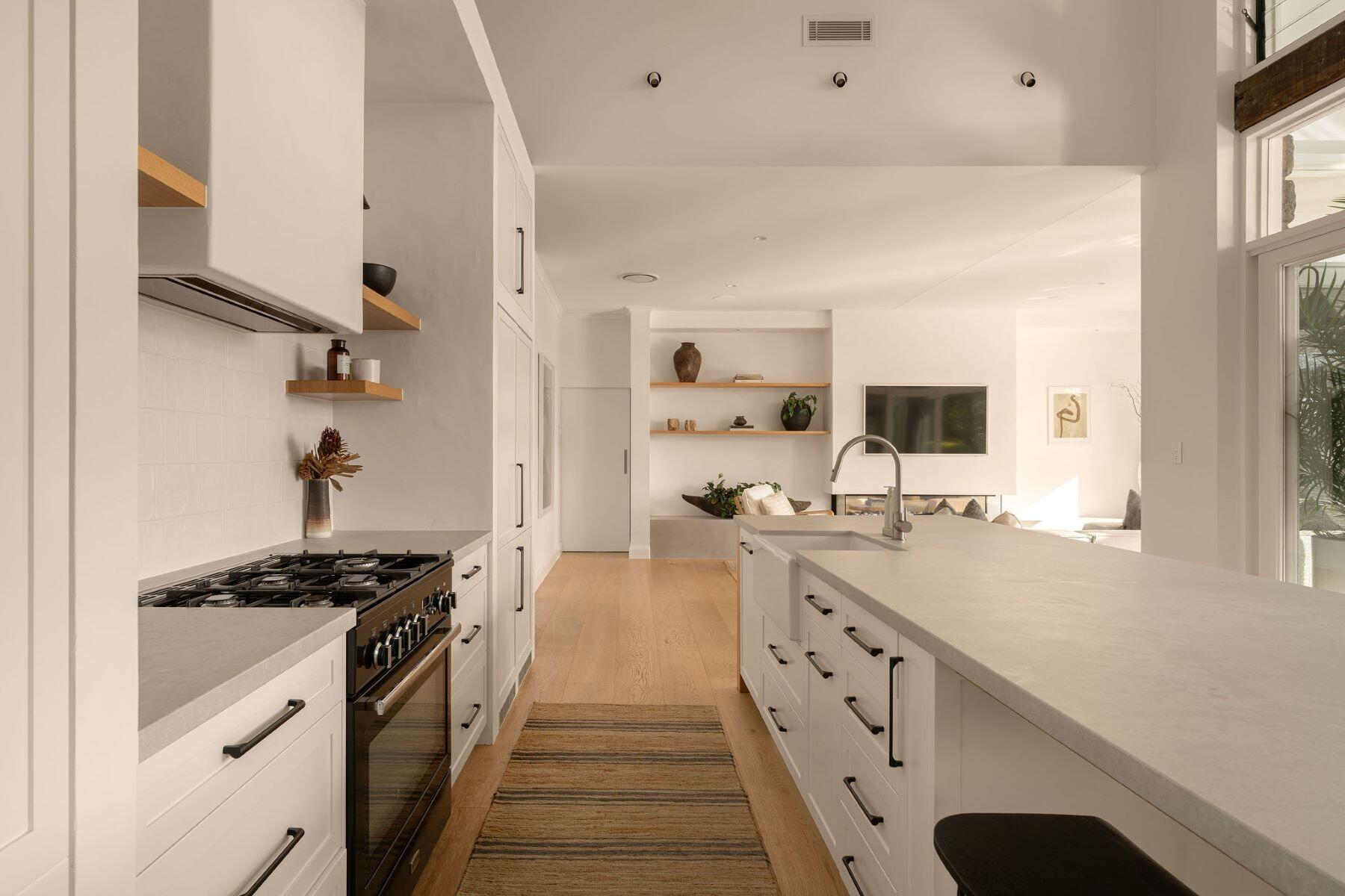 - Elegant and modern farmhouse aesthetic warmed by wide plank European Oak timber floors and travertine finishes.