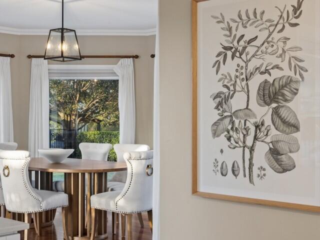 - Dining room w/ timber flooring, split system A/C, sheer curtains, sheer roller blinds and block out roller blinds, overlooking pool area, glass and screen doors out to covered patio