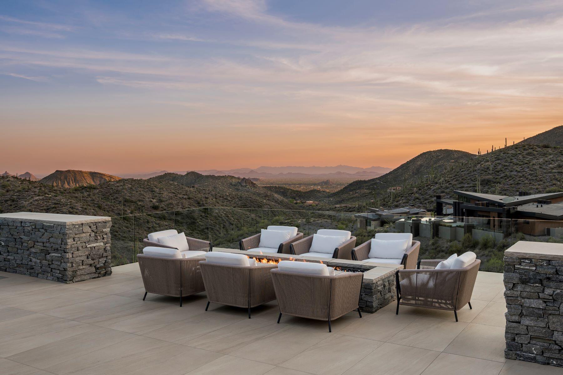 One of a kind Contemporary estate located in the world class community of Desert Mountain in North Scottsdale, Arizona. Designed and built by one of the top design build firms-JK Properties-Justin Kilbane. Situated on 4.7 acres at the top of the Desert Mountain community and overlooking the valley of the sun, this setting is arguably one of the best in all of North Scottsdale. With 3,000 acres of open space that parallels the home as well as the Tonto National Forest just to the north, this extremely private setting is unmatched. As you enter the private gated driveway, you will be awed by the striking design of this home. Once inside the one level open great room floor plan leads to an expansive outdoor living area complete with spectacular views in every direction. Enjoy the dual sided fire feature as you take in the panoramic desert and mountain views. The seamless connection between the indoor and outdoor spaces allows for the perfect environment to entertain guests or unwind in solitude. The design incorporates floor-to-ceiling glass walls that flood the space with natural light, while also offering unparalleled privacy.