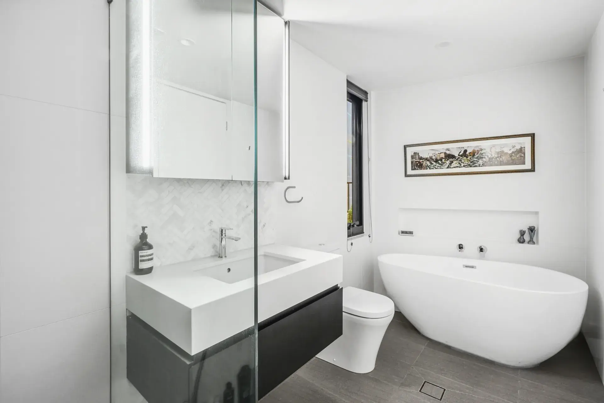 - Main bathroom with frameless shower, herringbone feature tiling, and floating timber vanity with stone top and great storage